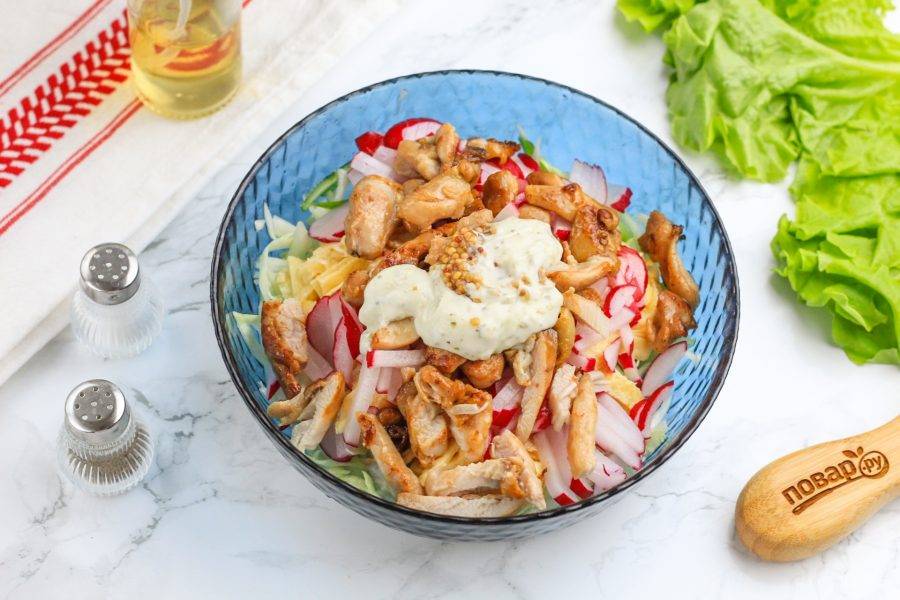 Добавьте обжаренную курицу, соус "Тартар" и немного горчицы. Перемешайте салат.