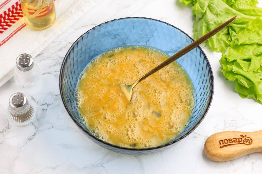 Взбейте куриные яйца в глубокой емкости, всыпьте соль и влейте 30 мл. воды. Взбейте в течение 1-2 минут.