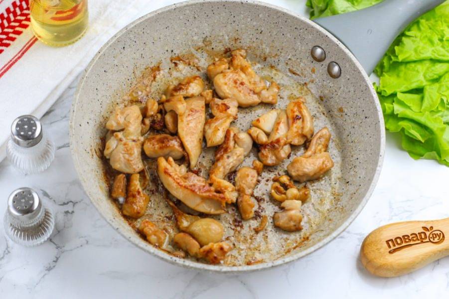 Нарежьте мякоть курицы на части, посолите и перемешайте с горчицей. Влейте в сковороду оставшееся растительное масло и обжарьте кусочки курицы примерно 5-6 минут. Время от времени перемешивайте их.