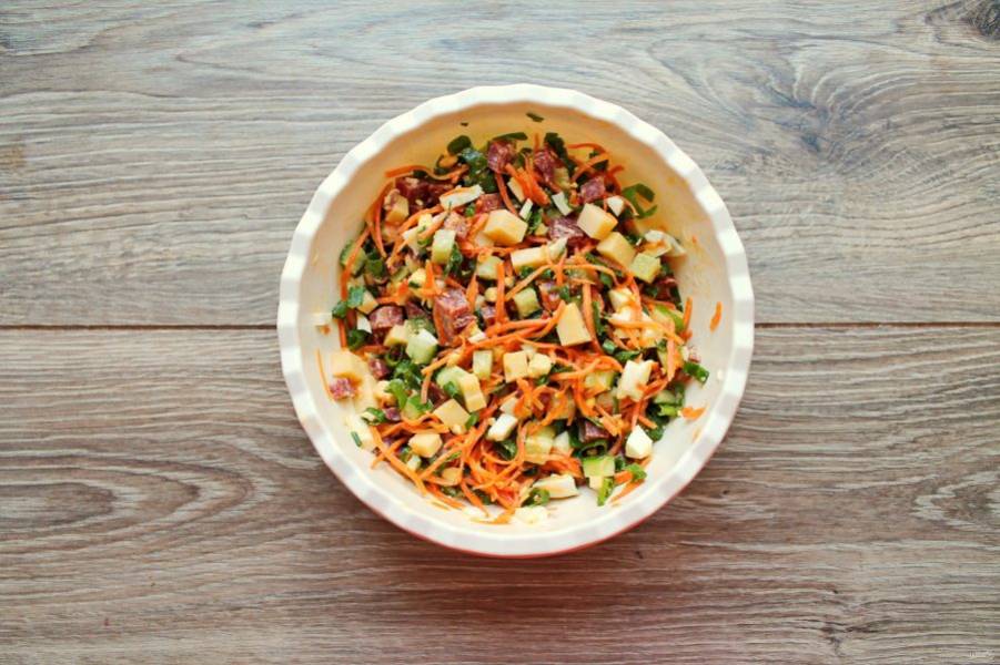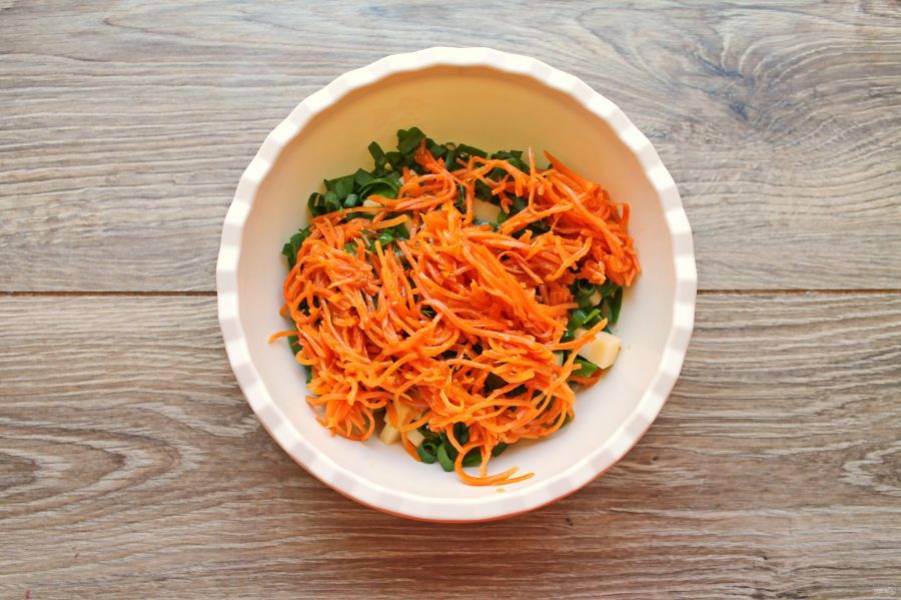 Выложите в миску с салатом морковь по-корейски.