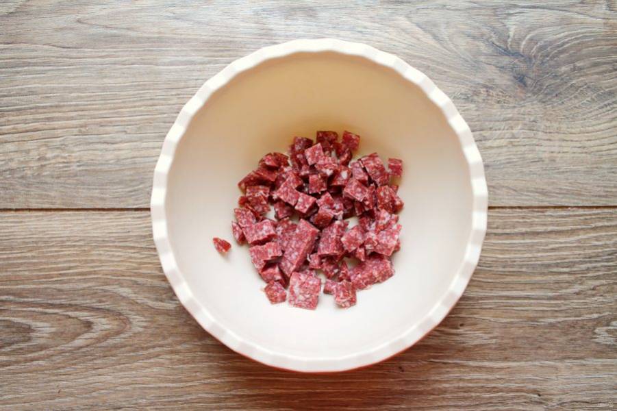 Копченую колбасу порежьте мелким кубиком и выложите в миску.