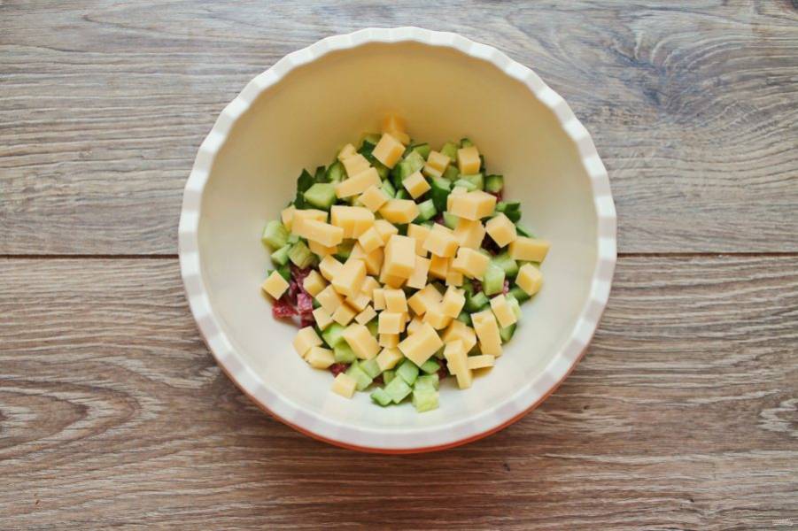Сыр нарежьте кубиком и добавьте к огурцу и колбасе.
