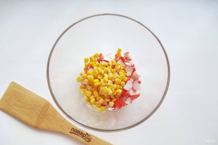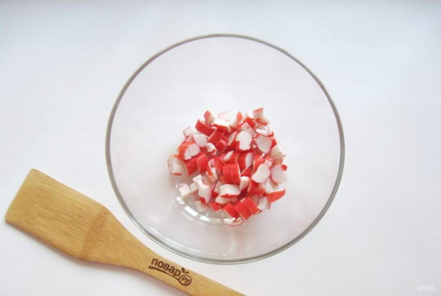 Крабовые палочки нарежьте кубиками и выложите в салатник.
