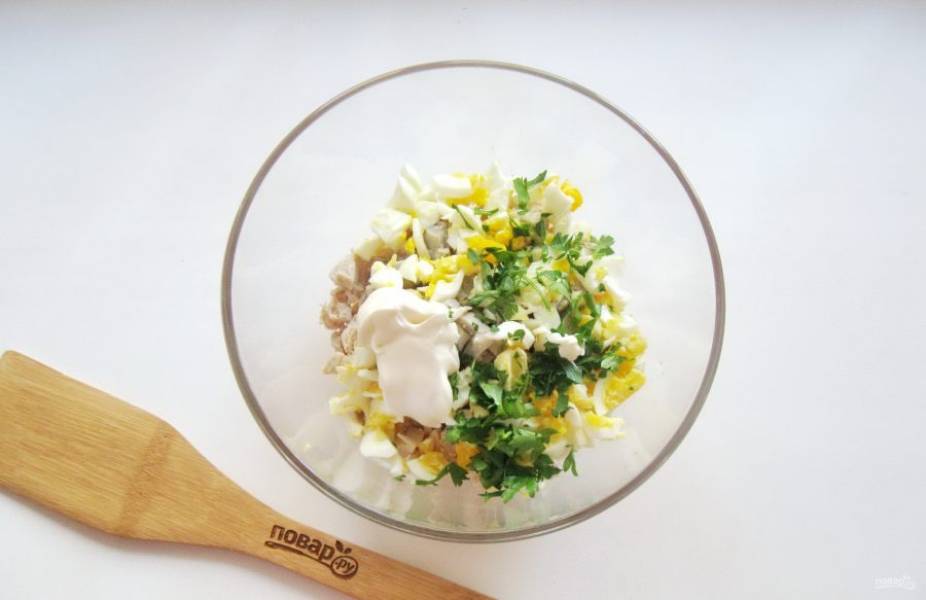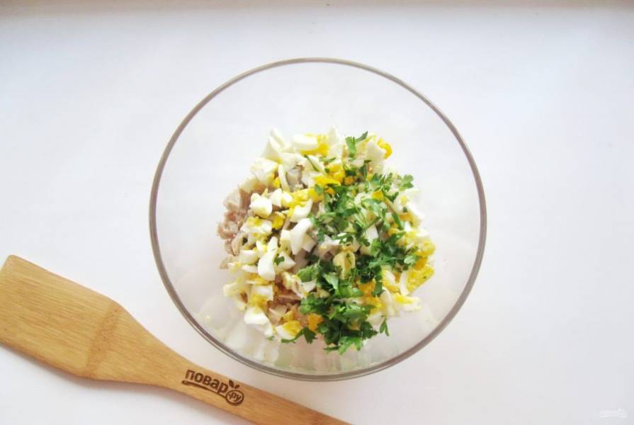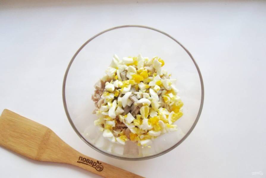 Яйца сварите вкрутую, охладите и очистите. Нарежьте мелко и добавьте в салат.
