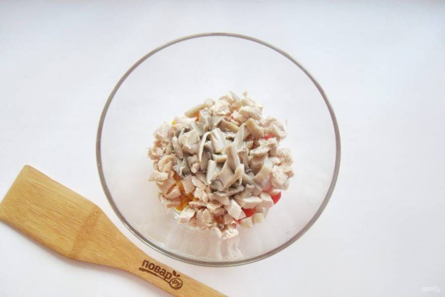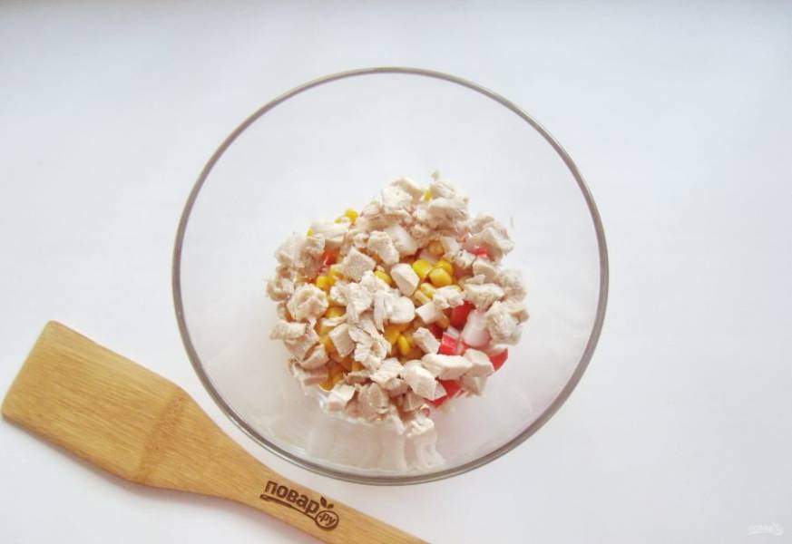 Куриную отварную грудку нарежьте мелко и добавьте в салат.