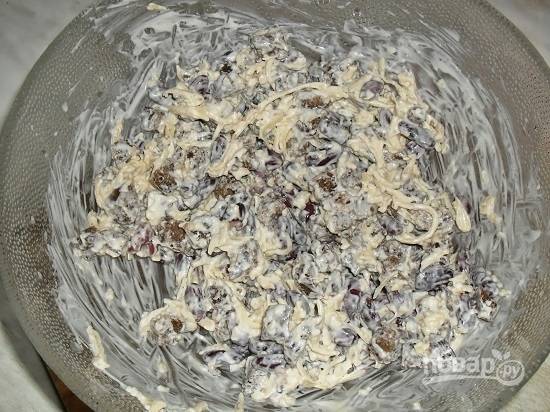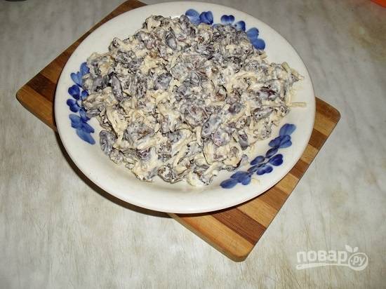 Добавим измельченный чеснок, соль и перец. Заправим майонезом.