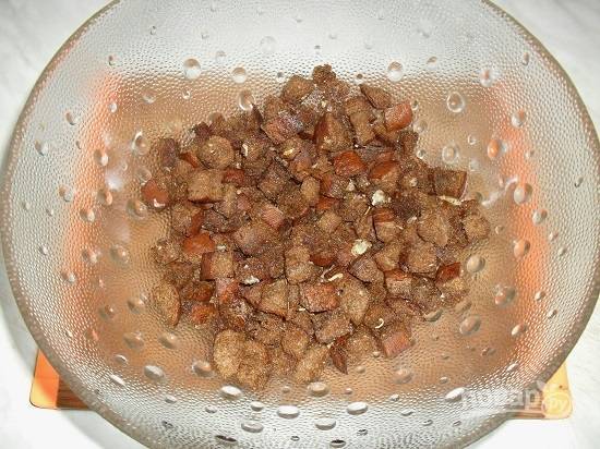 Ломтики хлеба нарезаем на кубики и обжариваем на растительном масле или подсушим в духовке.