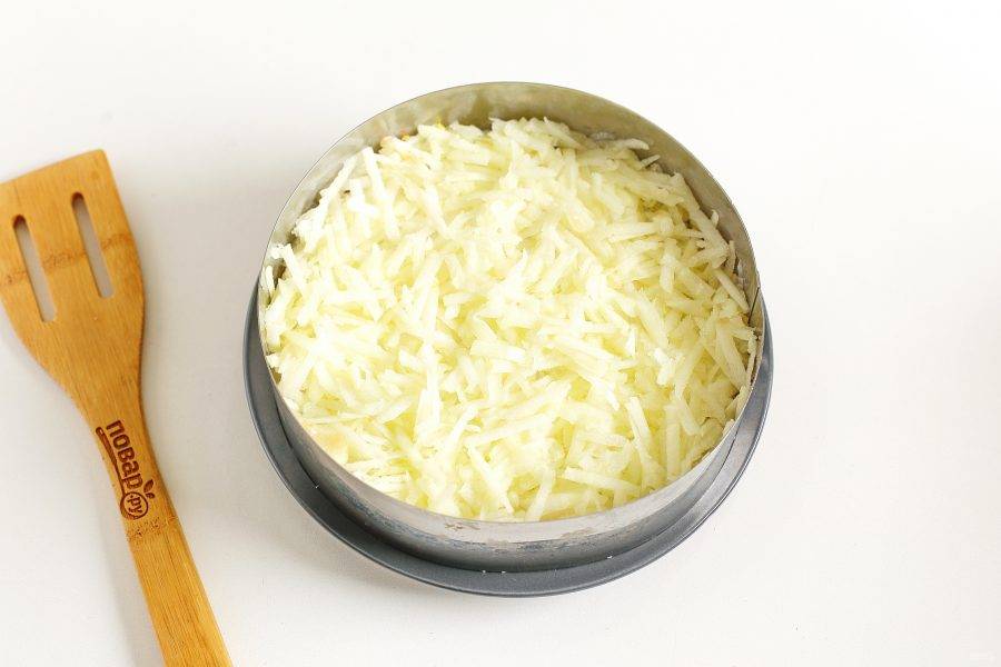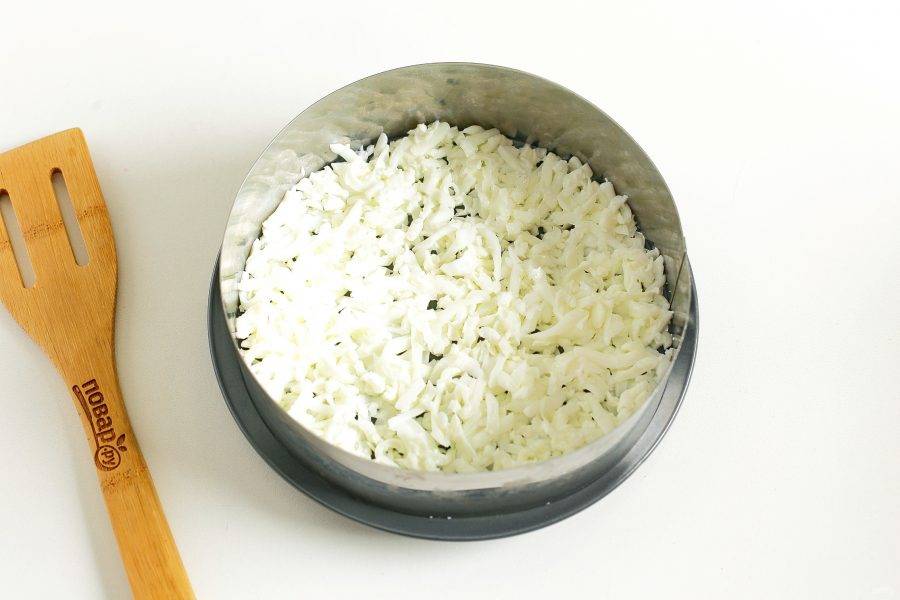 Яйца отварите «вкрутую», охладите, очистите, белок отделите от желтка. Белок натрите на крупной терке. На плоскую тарелку установите формовочное кольцо. Измельченные белки выложите первым слоем, смажьте майонезом.