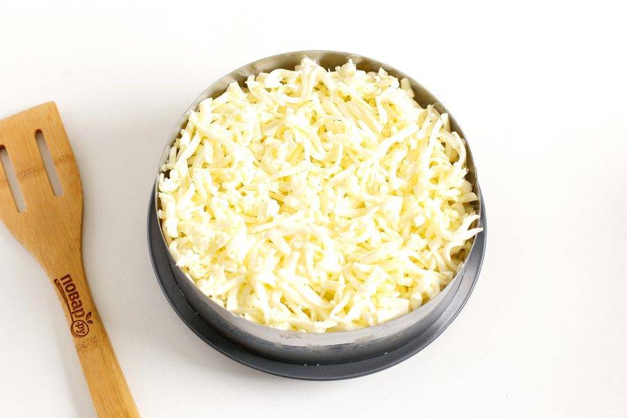 Сделайте слой из тертого плавленого сырка. Чтобы сырок было удобнее измельчать на терке, заранее подморозьте его в морозильной камере, чтобы он стал тверже.