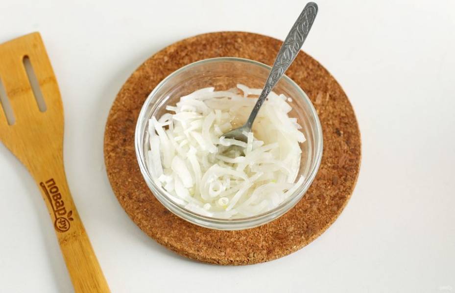 Репчатый лук очистите, нарежьте полукольцами или четвертинками, присыпьте щепоткой сахара и соли, помните луками, чтобы лук пустил сок. Выложите лук в глубокую емкость, влейте 1 ст.л. уксуса и такое же количество воды. Яблочный уксус можно заменить лимонным соком. Смесь перемешайте, маринуйте лук 5 минут. По желанию предварительно лук можно обдать кипятком.