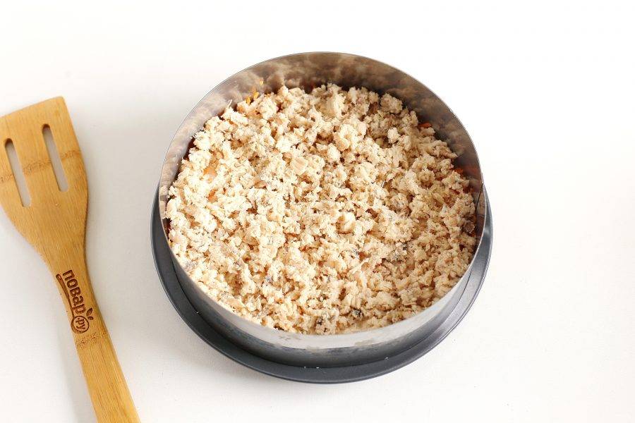 Консервированную горбушу достаньте из масла, удалите крупные косточки и раздавите вилкой. Выложите горбушу на морковь, разровняйте ложкой. Этот слой можно присыпать солью.