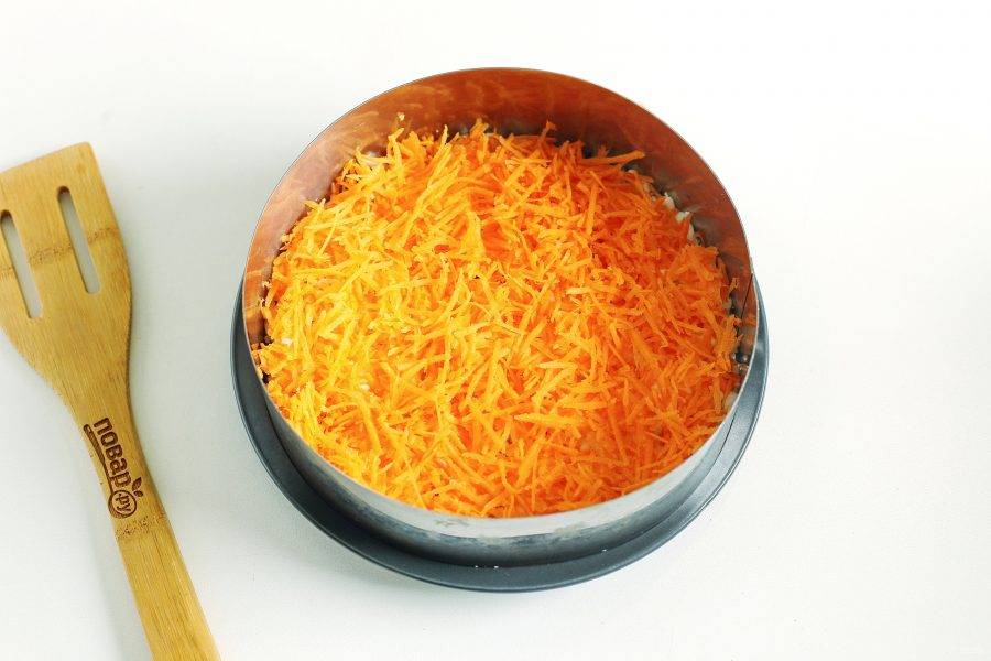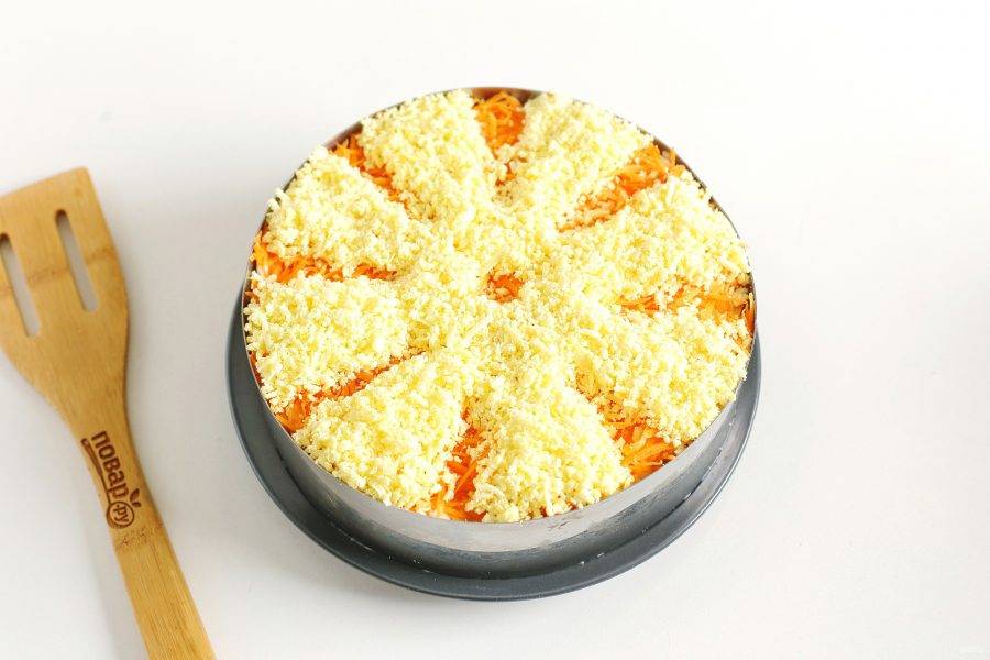 Сырую морковь очистите, нашинкуйте на средней или мелкой терке. Примерно половину тертой моркови выложите на белок. Сверху моркови сделайте сетку из майонеза.