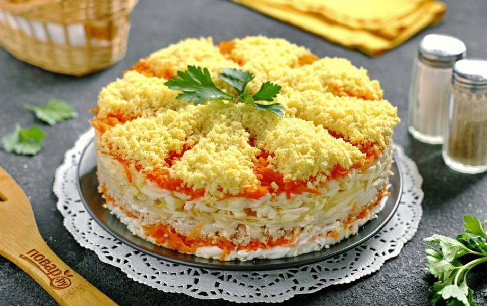 В завершении сделайте слой из моркови и тертых желтков. Чтобы верхушка салата смотрелась красивее, компоненты можно выложить полосками. Салату дайте 1 час для пропитки в холодильнике, потом подайте его на стол.