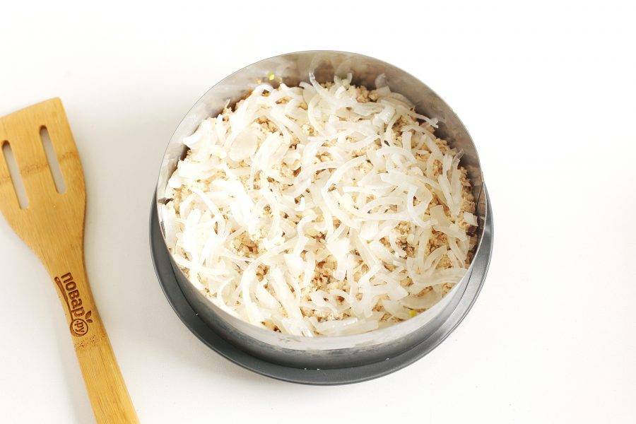 Сверху горбушу присыпьте маринованным луком, далее покройте майонезом.