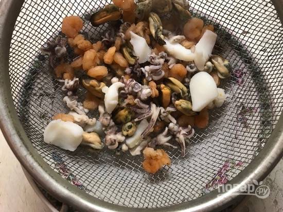 3. Готовые морепродукты откиньте на дуршлаг, чтобы стекла вся жидкость.