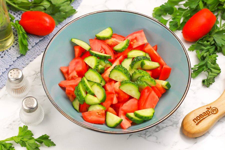 Срежьте хвостики с огурца и нарежьте полукольцами, добавьте к помидорной нарезке.
