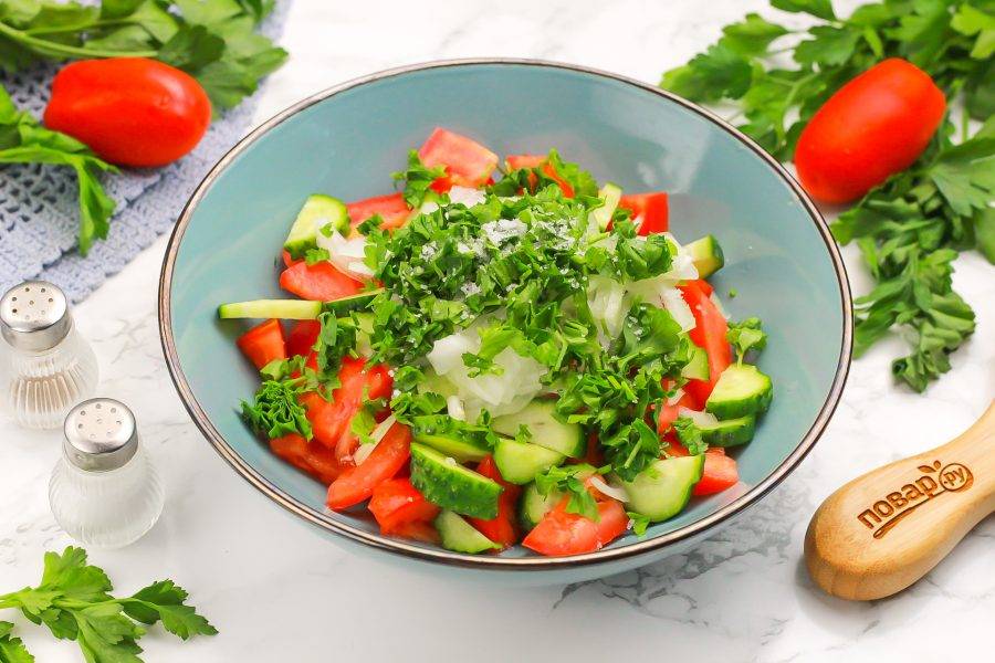Промойте и измельчите петрушку, всыпьте нарезку вместе с солью в салатник. Полейте салат растительным маслом и перемешайте.