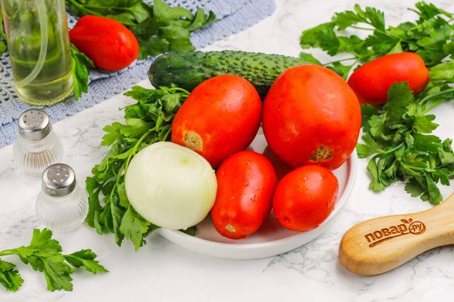 Подготовьте указанные продукты. Промойте помидоры и огурец в воде, очистите лук от кожуры и тоже промойте.