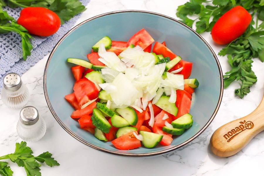 Нарежьте луковицу тонкими полукольцами и добавьте к остальным ингредиентам.