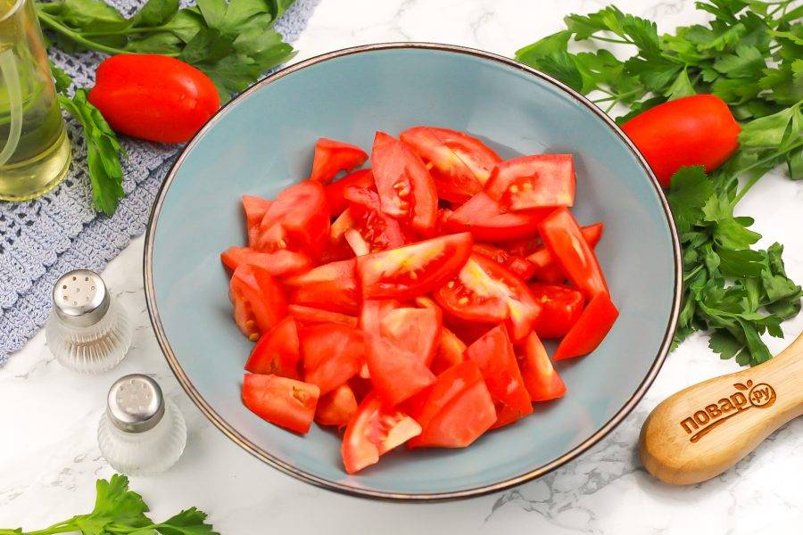 Вырежьте из помидоров зеленые сердцевинки, нарежьте мелкими ломтиками и высыпьте нарезку в салатник.