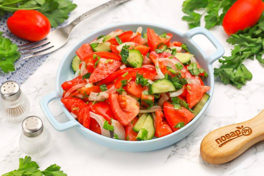 Красочный салат, который отлично подойдет к любому мясному блюду как гарнир, готовится за несколько минут. Вы можете добавить в него болгарский перец, белокочанную капусту, различную свежую зелень.