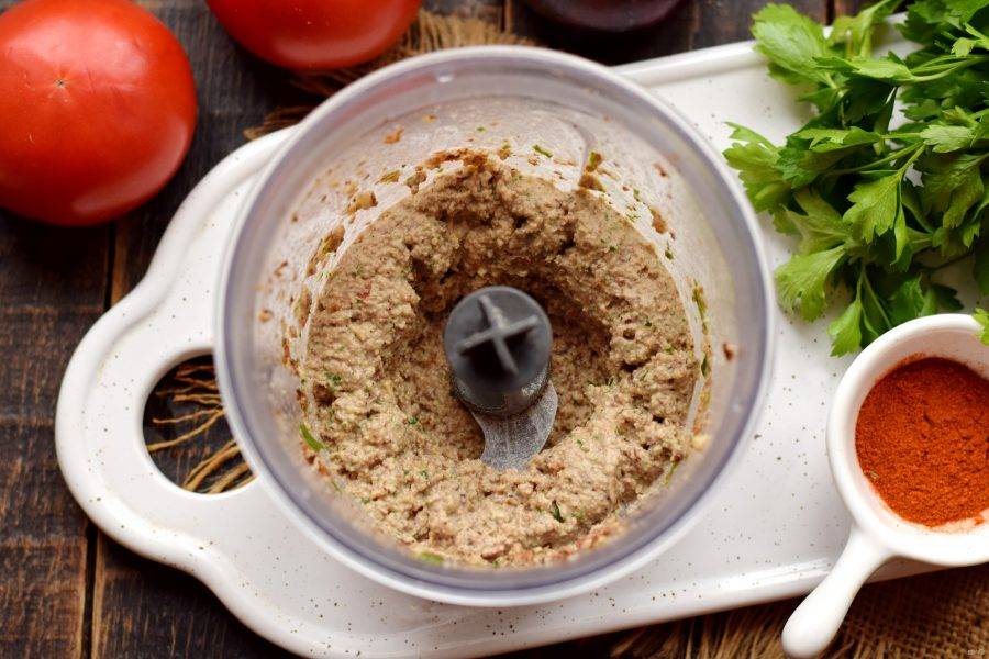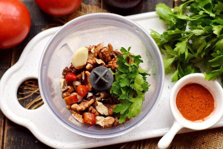 Ядра грецких орехов всыпьте в чашу блендера, добавьте очищенный зубочек чеснока, влейте бальзамический уксус, всыпьте хмели-сунели и соль. Кинзу ополосните, листочки добавьте к орехам. Острый перец нарежьте кольцами, очистите от семян. Если вы хотите более жгучий вкус заправки, семена можно оставить. Количество перца может варьироваться в зависимости от вкуса.