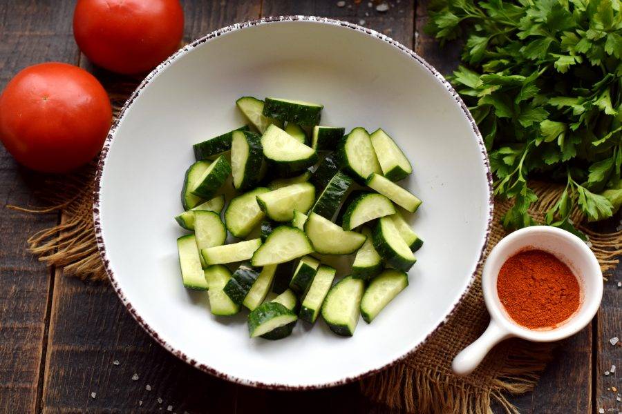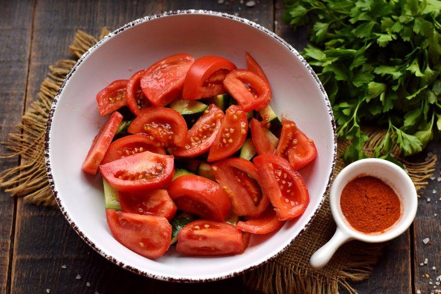 Помидоры нарежьте крупными дольками, добавьте к огурцам.