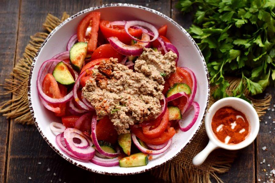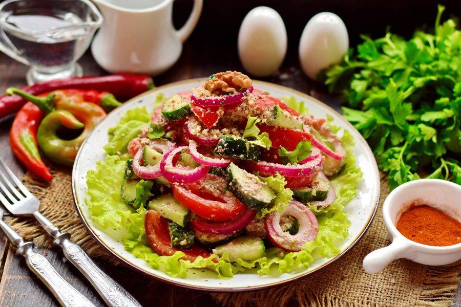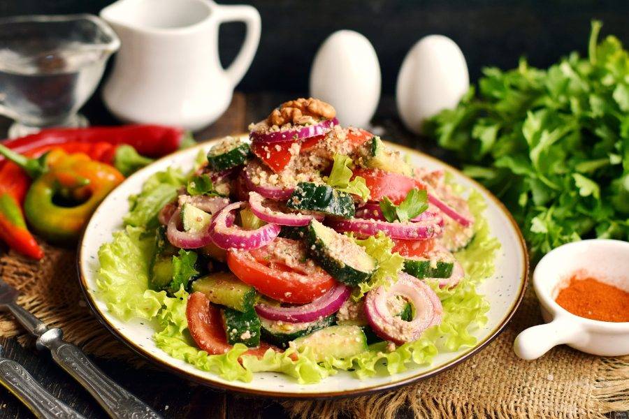 Овощи заправьте ореховым соусом, тщательно перемешайте.