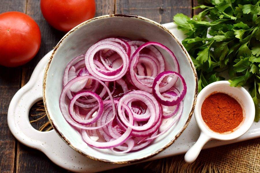 Салатный лук очистите, нарежьте тонкими кольцами, замаринуйте в уксусе, перемешайте, отставьте на время в сторону.
