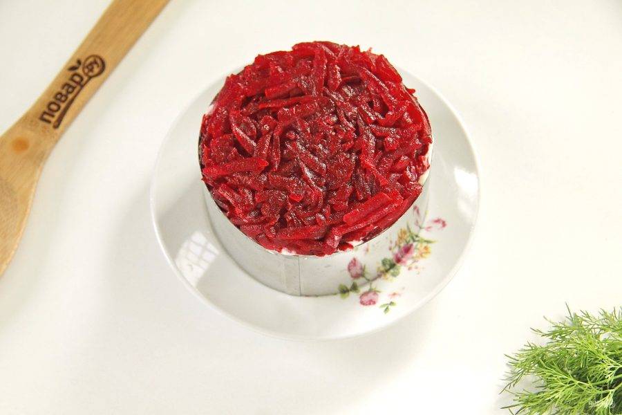 Свеклу, морковь и яйца натрите на крупной терке. Мясо нарежьте мелкими кусочками. Первым слоем выложите нарезанное мясо. Все слои смазывайте майонезом и по необходимости подсаливайте.