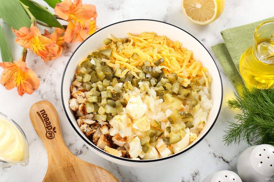 Нарежьте готовую грудку небольшими кубиками и переложите в салатник. Добавьте нарезанные кубиками варёные яйца, огурцы и лук. Лук можно предварительно ошпарить кипятком, чтобы убрать горечь. Сыр натрите на крупной тёрке. Салат посолите, поперчите, заправьте майонезом и перемешайте.