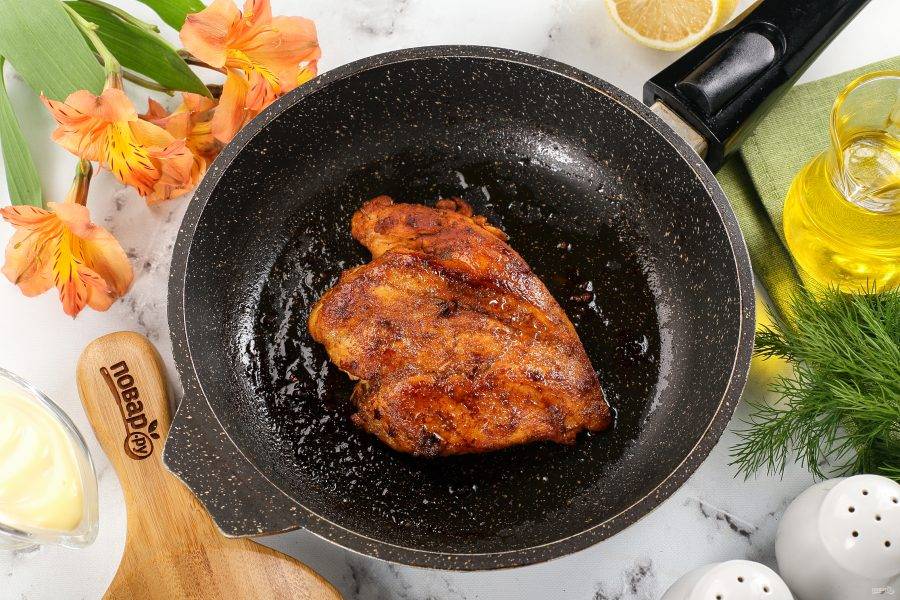 Грудку выложите на раскалённую сковороду с маслом, накройте крышкой и на умеренном огне обжарьте с двух сторон до готовности. В процессе можно добавить чуть-чуть воды, чтобы она дошла паром.