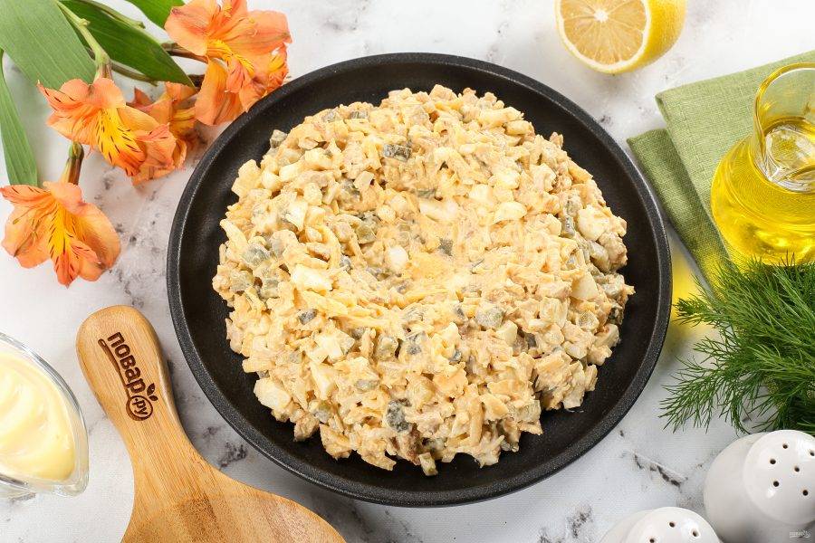 Выложите салат на блюдо в форме горки и по центру сделайте небольшое углубление.