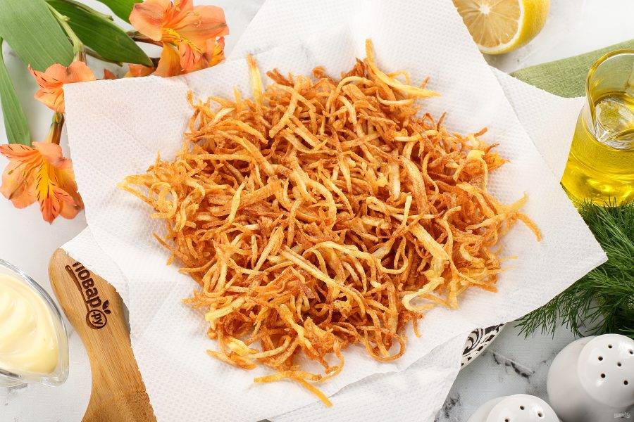 Картофель нарежьте тонкой соломкой или натрите с помощью тёрки для корейской моркови. Залейте холодной водой и хорошо промойте от крахмала, можно повторить процедуру 2-3 раза. Затем откиньте на сито, разложите на чистое кухонное полотенце и обсушите.