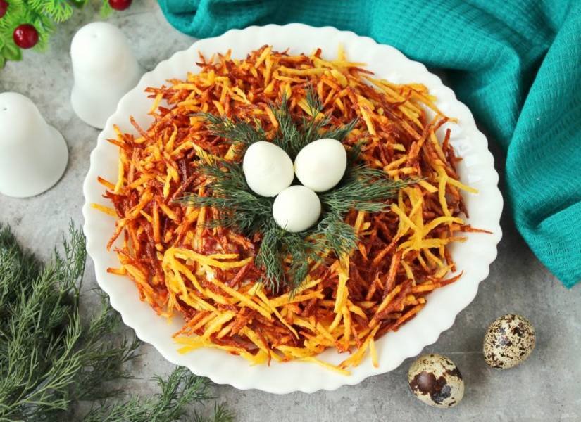Картофель натрите на терке для моркови по-корейски, промокните бумажной салфеткой и обжарьте в горячем растительном масле порциями до золотистой, хрустящей соломки. Переложите ее на бумажное полотенце, чтобы убрать лишнее масло и остудите. Картофелем засыпьте верх салата, из зелени сделайте гнездо, выложите перепелиные яйца и подавайте к столу.