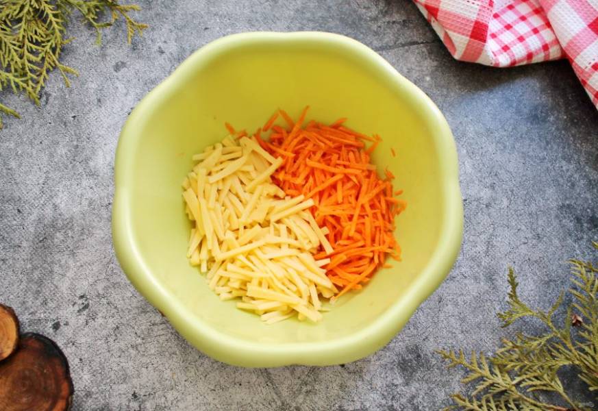 Свежую морковь и твердый сыр порежьте тонкой соломкой и выложите в салатник.