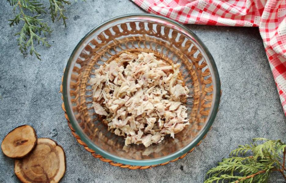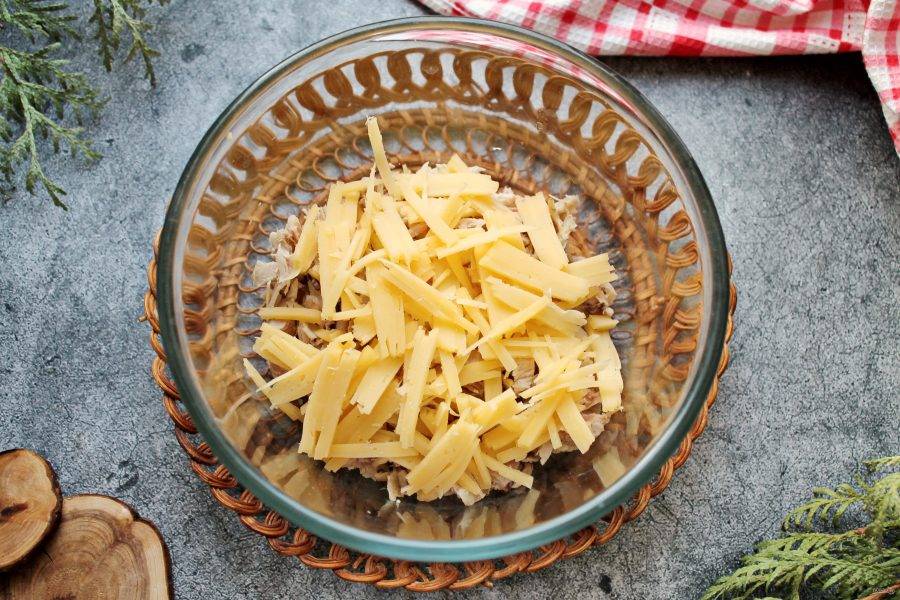 Сыр порежьте соломкой и добавьте к курице. Оставьте немного для украшения.