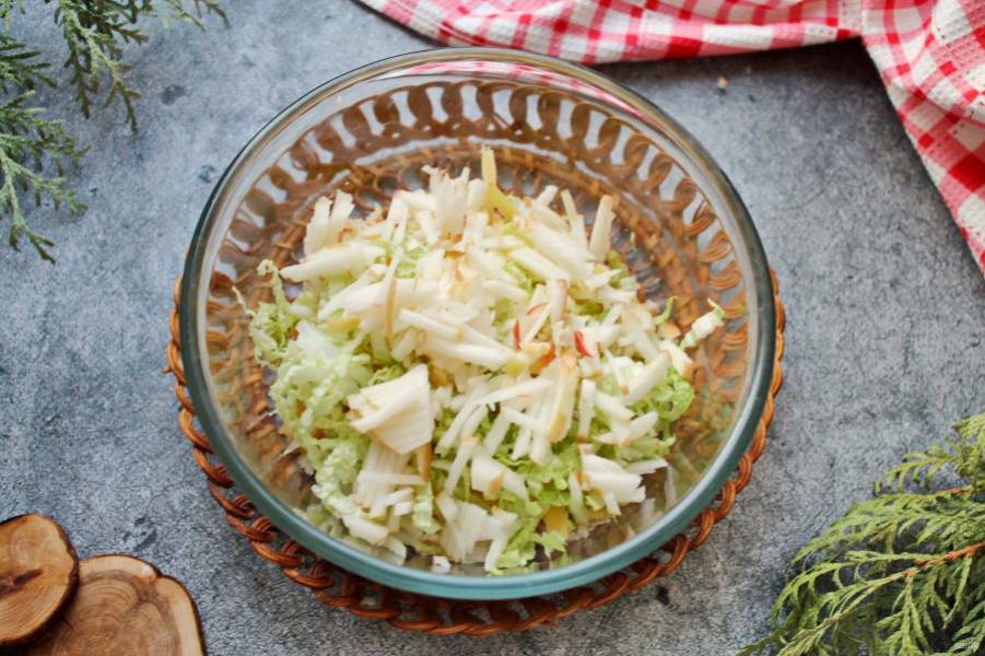 Пекинскую капусту тонко нашинкуйте и добавьте в салат.