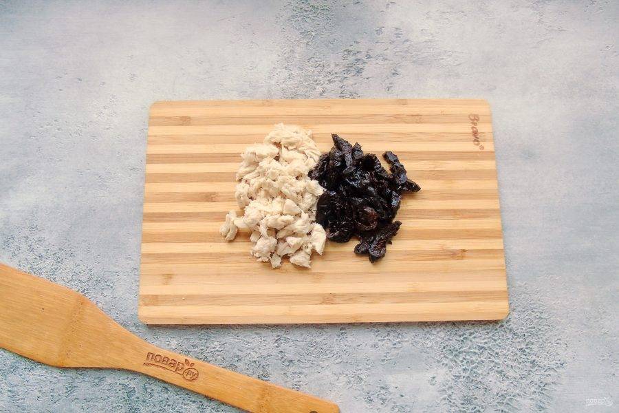 Отварное куриное филе и чернослив без косточек мелко нарежьте.