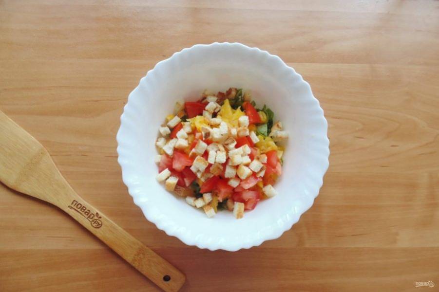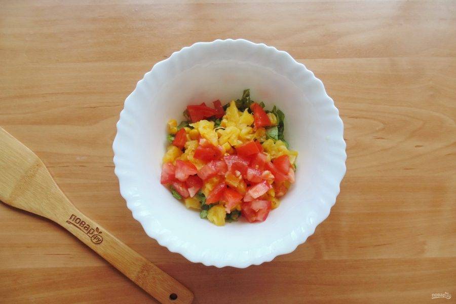 Нарежьте помидор, убирая семечки и лишнюю жидкость.