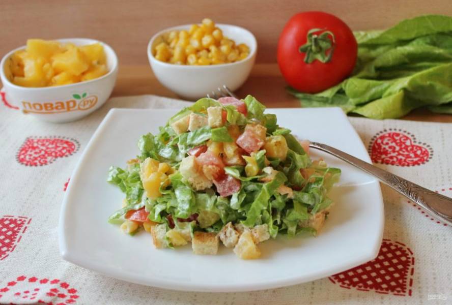 Когда нежданно-негаданно нагрянули гости, есть выход из положения. Приготовьте вот такой салат, буквально из того, что есть в холодильнике. Закуска быстрая, вкусная, простая и сытная!