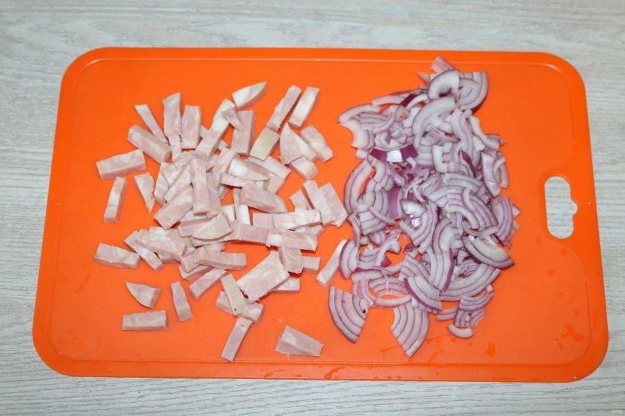 Ветчину нарежьте соломкой, лук нарежьте четверть кольцами.