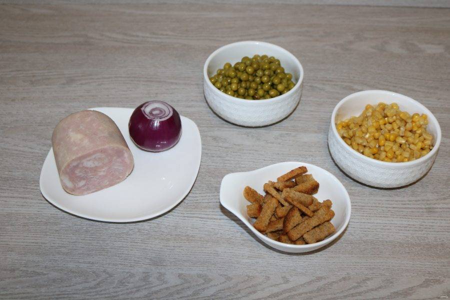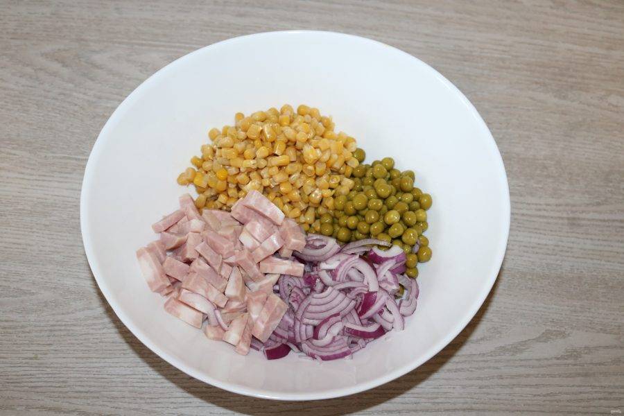 В глубоком салатнике соедените ветчину, лук, зелёный горошек и кукурузу.