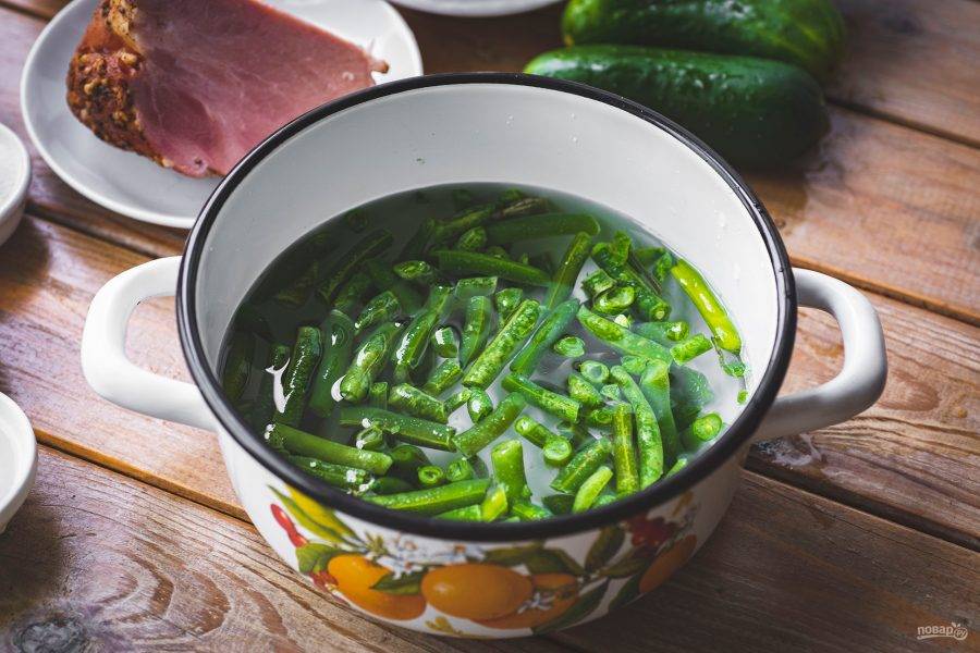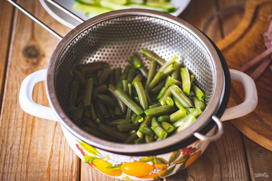 Отваренную стручковую фасоль откиньте на дуршлаг и дайте ей остыть.