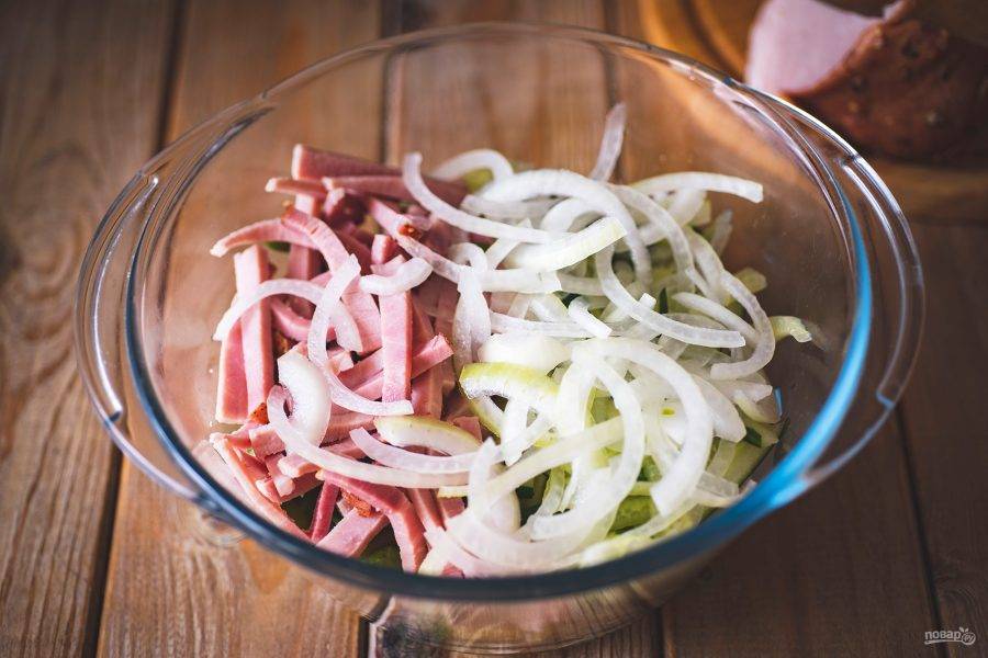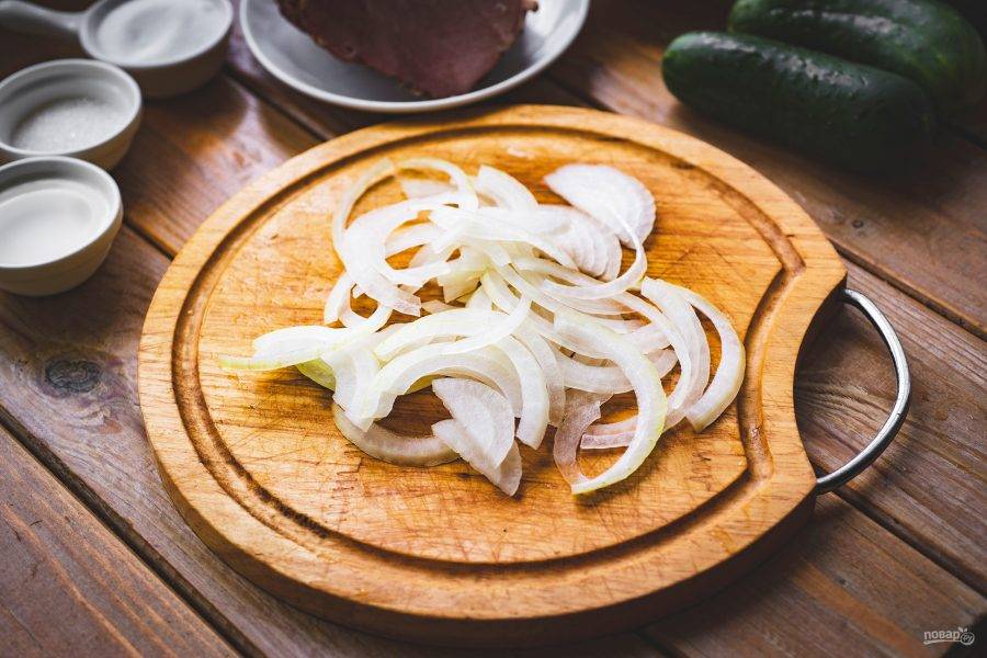 Лук почистите и нашинкуйте тонкими полукольцами.