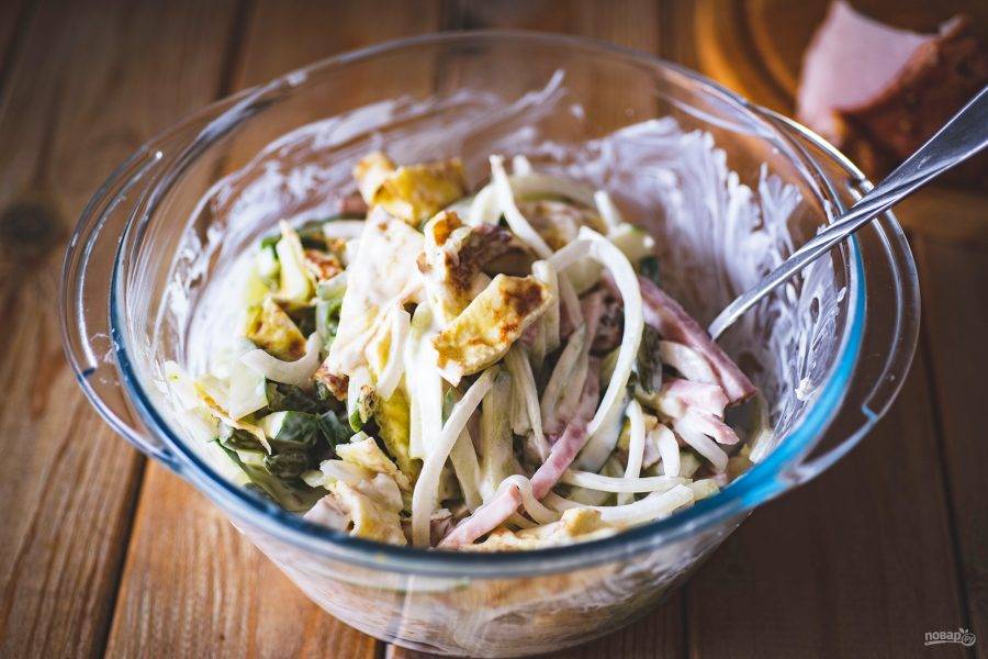 Заправьте салат майонезом, добавьте соль и молотый перец, перемешайте.
