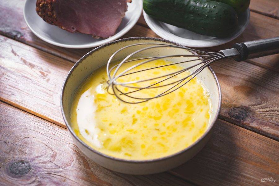 В миску вбейте яйца и добавьте 2 ч.л. майонеза, перемешайте все венчиком.