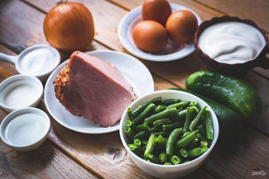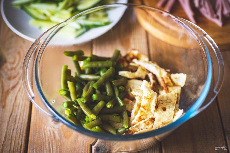 В салатную миску выложите стручковую фасоль, нарезанные яичные блинчики.