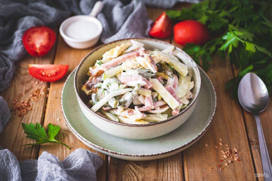 Очень сытный, вкусный салатик из доступных продуктов подойдет как на каждый день, так и к праздничному застолью. При желании майонез можно заменить на сметанный соус или йогурт — тоже очень вкусно!