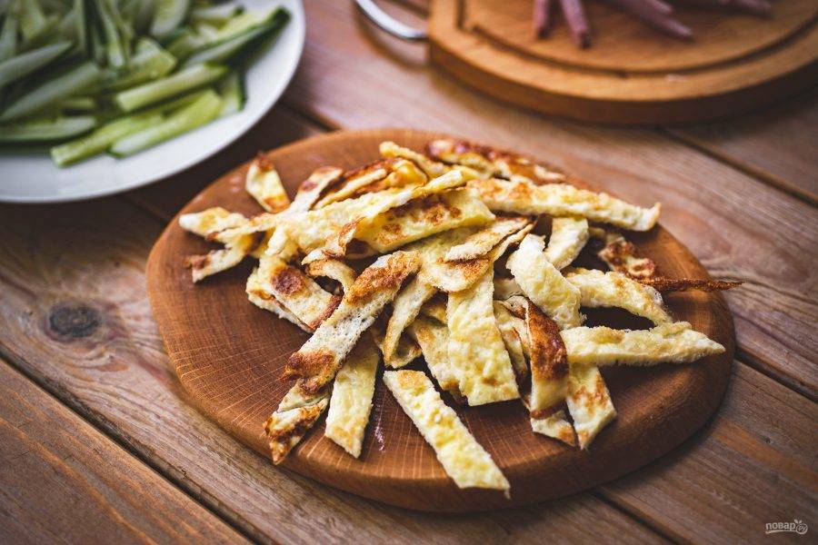 В сковороде разогрейте растительное масло и порционно заливайте яичную смесь — приготовьте яичные блинчики. Всего у меня получилось 3 яичных блинчика.